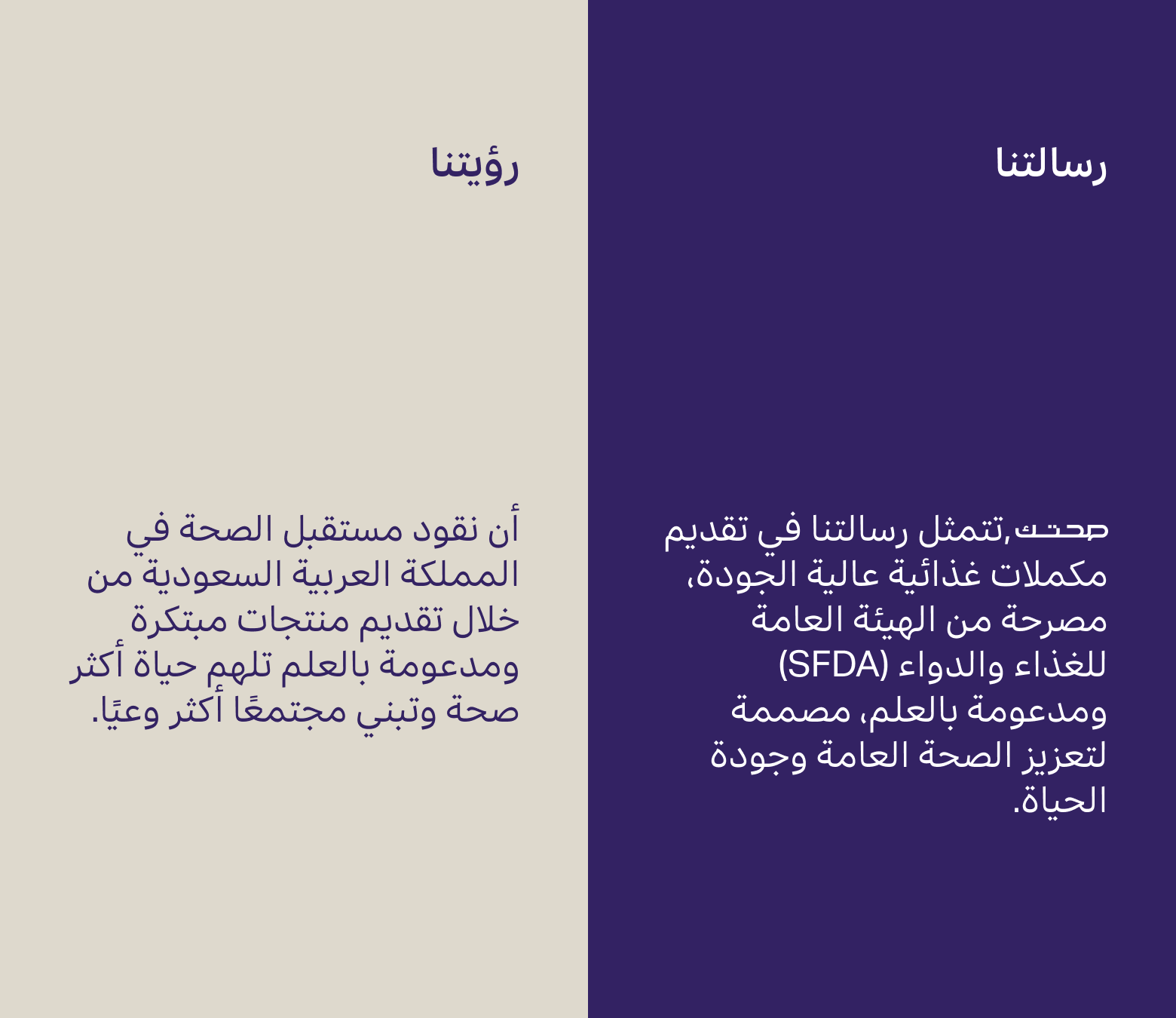 نكرّس جهودنا لتقديم منتجات مميزة مصرحة من الهيئة العامة للغذاء والدواء (SFDA) ومدعومة بالعلم، مصممة لتعزيز صحتك العامة. نحن ملتزمون بتوفير مكملات غذائية عالية الجودة تلبي الاحتياجات الصحية الفريدة في المملكة العربية السعودية.